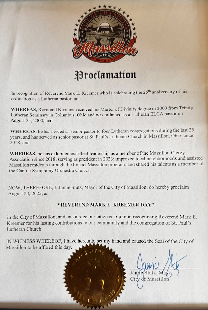 Massillon Mayor Jamie Slutz provided a nice surprise in recognition of all Pastor Mark has done for the community: "REVEREND MARK E. KREEMER DAY" on Sunday, August 24, 2025.